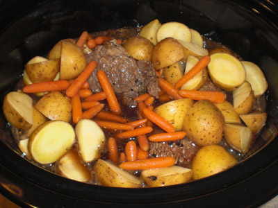 I used my new crock pot to make pot roast last night. I browned beef in a pan with a little olive oil. After removing the meat from the pan, I added red wine and beef broth. I put the meat in the crock pot, followed by the liquid and scrapings from the pan. Then I added yellow potatoes and baby carrots.